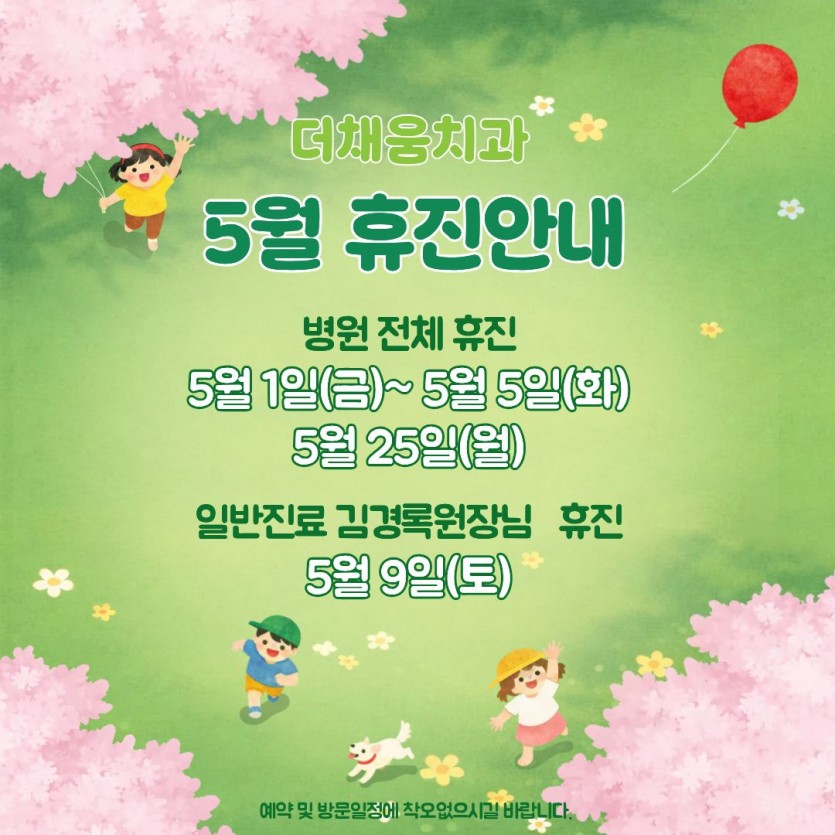 2026년 05월 진료일정 안내 페이지 정보 작성자 관리자 댓글 0건 조회 3회 작성일 26-04-02 13:42 목록 본문 안녕하세요. 진심을 다하는 더채움치과의원 입니다. 저희 더채움치과의원은5월 1일부터 5일까지 휴진입니다. 아울러 5월 9일은 교정진료만 가능하며, 5월 25일은 휴진입니다. 내원 및 예약에 참고해주세요. 감사합니다.