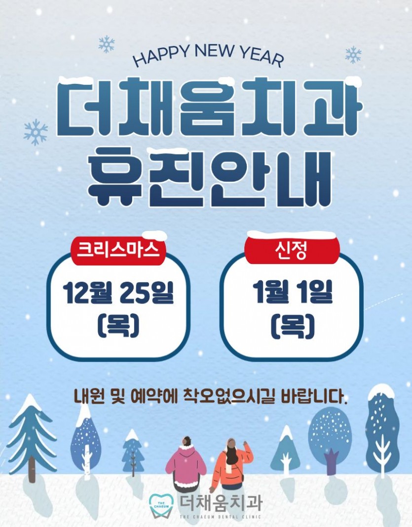2025년 12월 진료일정 안내 페이지 정보 작성자 관리자 댓글 0건 조회 24회 작성일 25-12-04 14:14 목록 본문 안녕하세요, 더채움치과입니다.어느새 한 해를 마무리하는 12월이 찾아왔습니다.올해도 저희 치과를 믿고 내원해 주신 모든 분들께 진심으로 감사드립니다.12월 진료 및 휴진 일정을 안내드립니다.내원 및 예약에 참고해 주세요.12월 25일(크리스마스) : 휴진1월 1일(신정) : 휴진12월 9일 및 16일은 김경록 원장님은 정상 진료하시고, 김난희 원장님은 단축 근로하십니다. 그 외 일정은 정상 진료합니다.(김난희 원장님은 매주 월요일 휴진, 김경록 원장님은 목요일 오전 휴진 입니다.)자세한 일정 및 예약 문의는 치과로 연락바랍니다. 올 한 해 수고 많으셨습니다.다가오는 새해에는 더 건강한 미소와 편안한 진료로 보답하겠습니다.감사합니다.더채움치과 드림